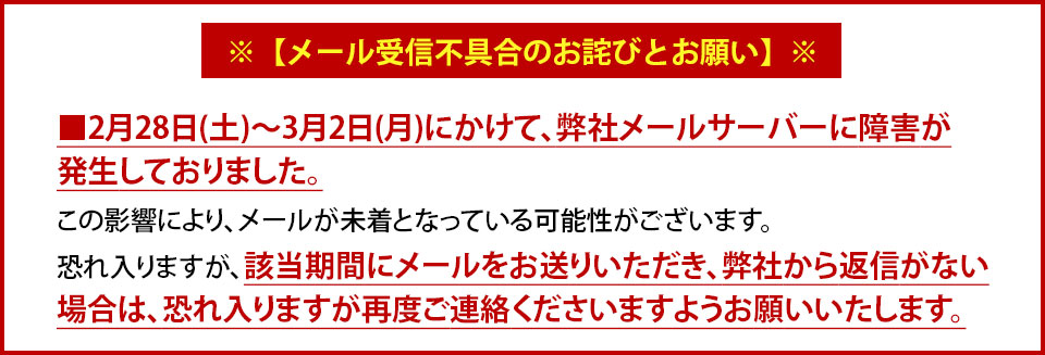 ■2月28日(土)~3月2日(月)にかけて、弊社メールサーバーに障害が発生しておりました。