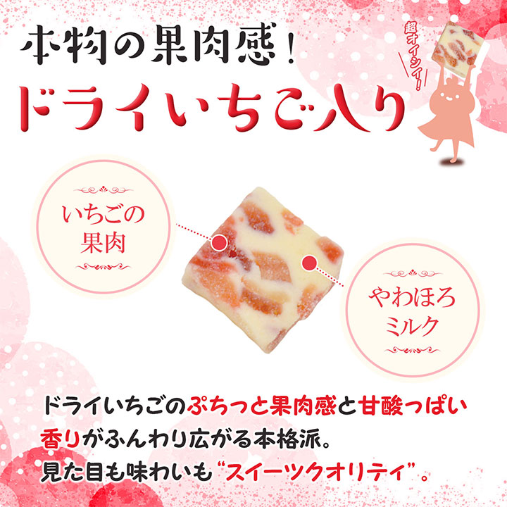干しいちご(いちご、砂糖)、全粉乳、水飴、砂糖、バター、ゼラチン、コンスターチ/酸味料、酸化防止剤(亜硫酸ナトリウム)、香料、赤色102号、(一部に乳成分・ゼラチンを含む)