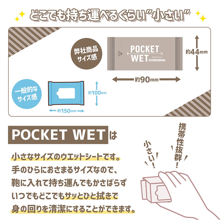 持ち運びに便利な手のひらサイズのウエットティシュです。