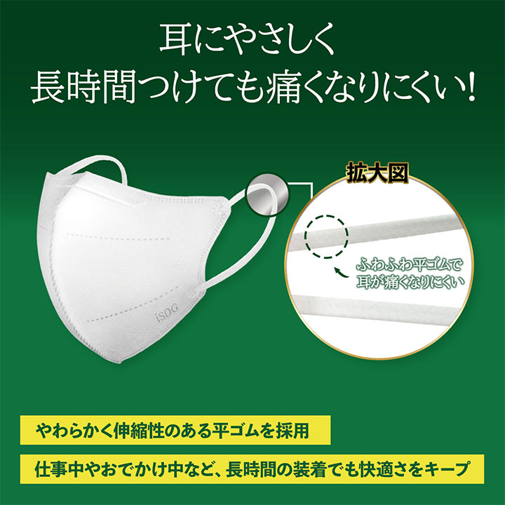 やわらかく、伸縮性の高い平ゴムを採用。長時間の着用時でも耳が痛くなりにくい。※